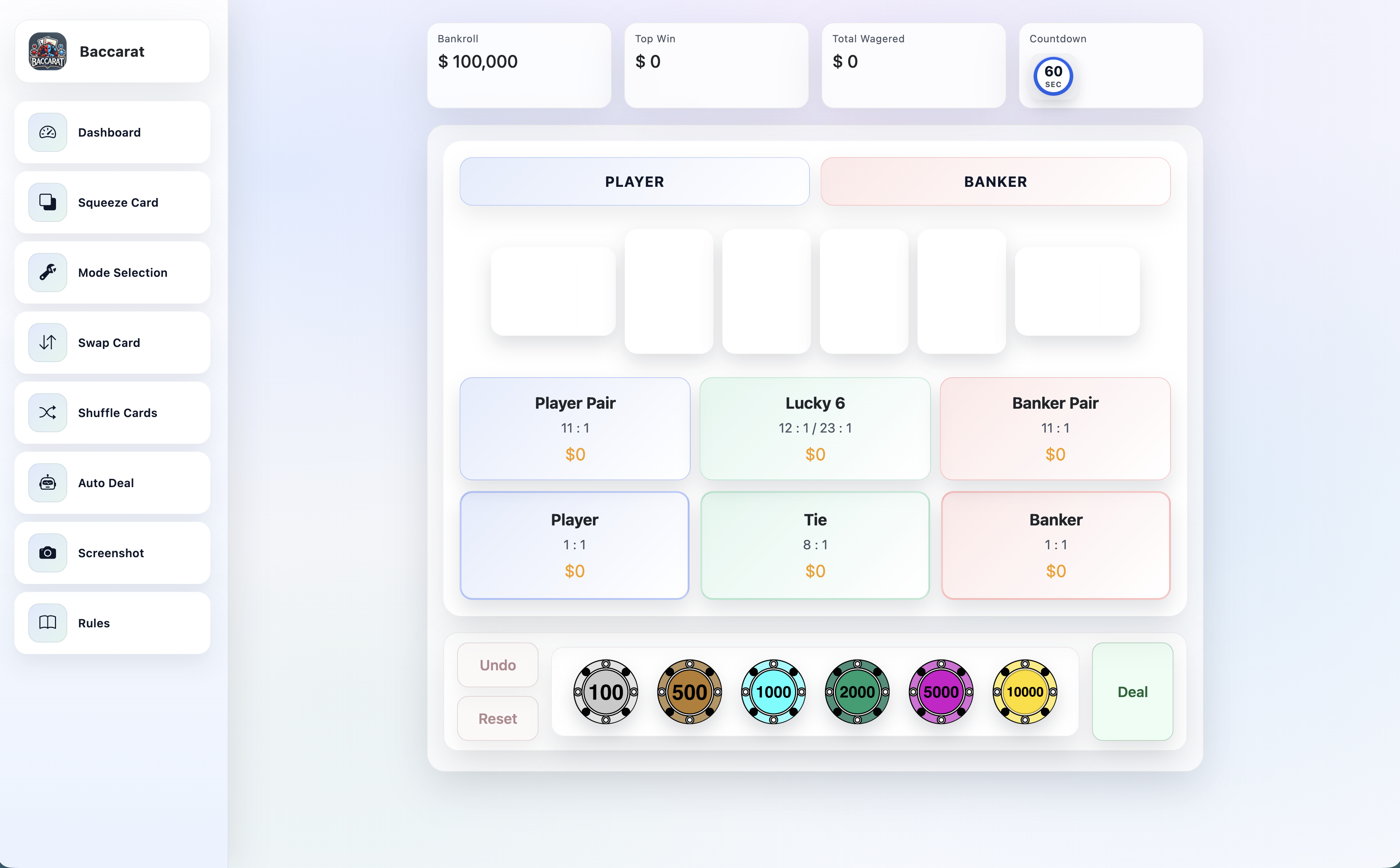 Single-page baccarat table with animated chip betting, squeeze reveals, auto-deal tools, and cookie-backed session persistence.