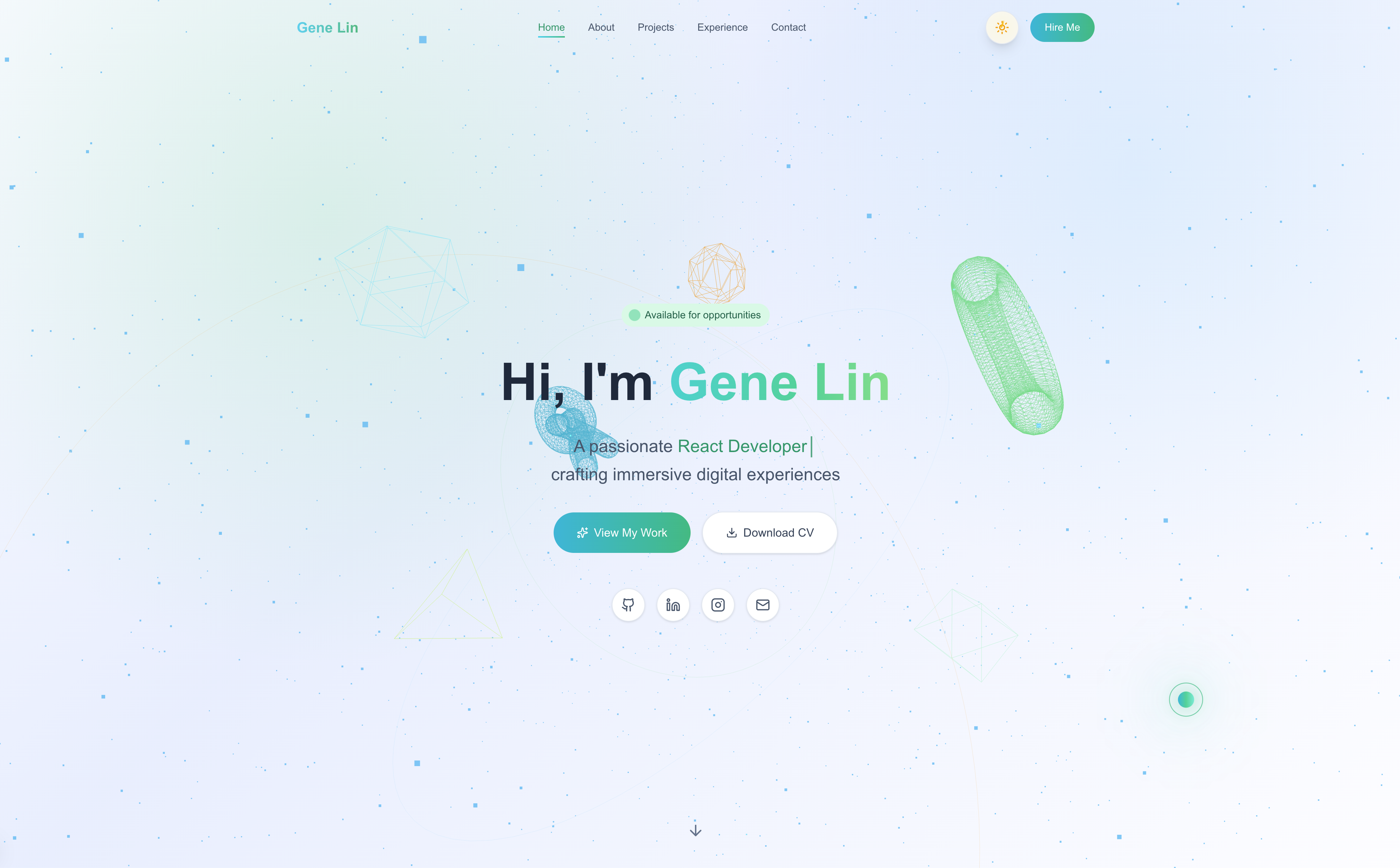 Next.js portfolio deployed at gene-software.com with a Three.js background, Framer Motion-driven hero, and modal project spotlights.
